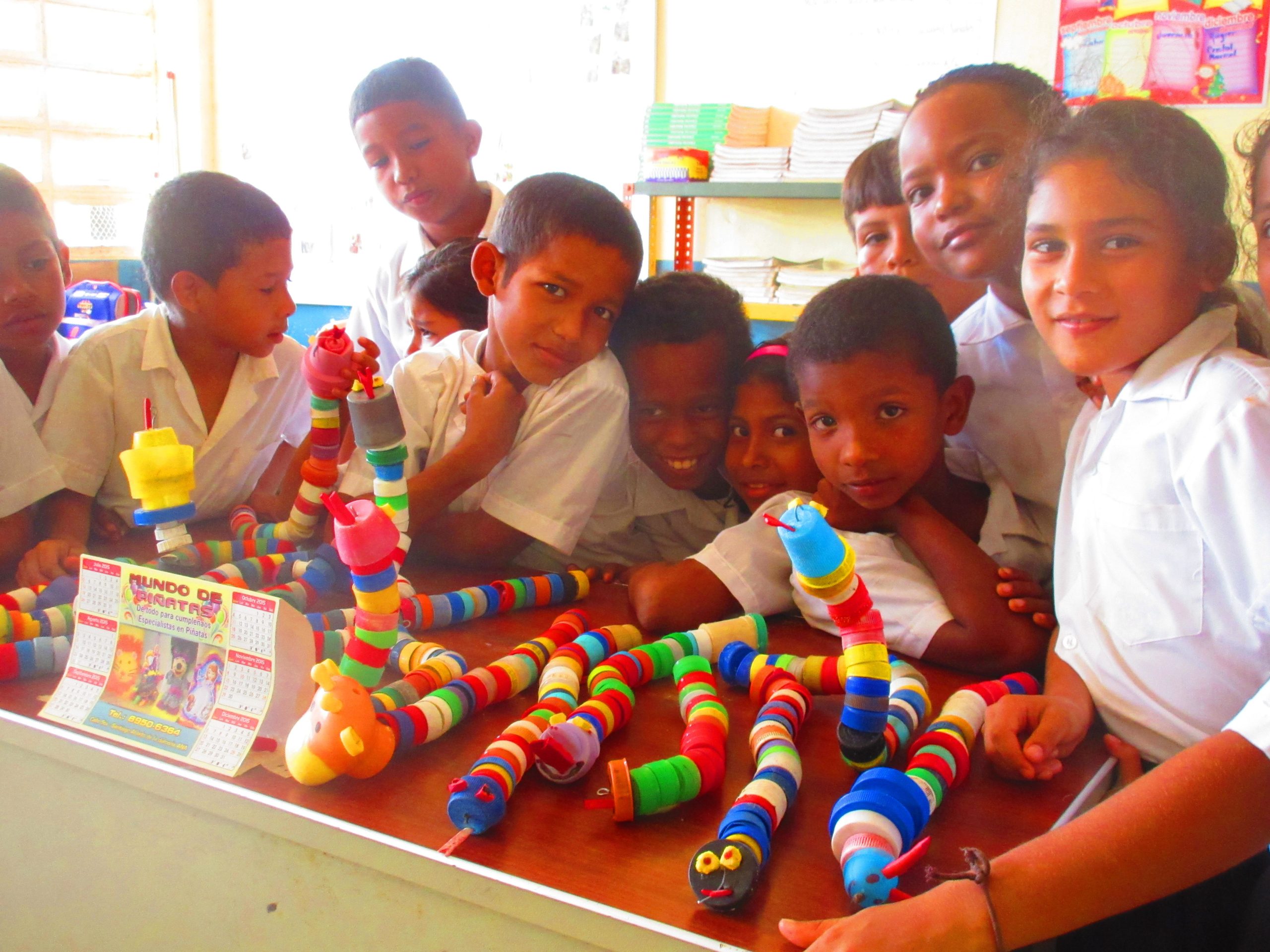 Michelle también se dedica a manejar el programa de educación ambiental en la escuelita de Santa Catalina y aunque dice que están empezando poco a poco en su comunidad es gracias a este programa y al ejemplo que da con su arte en su comunidad que le están ensenando a los niños a no ensuciar, a ser más responsables con la basura en sus casas y a reciclar lo que se pueda. Michelle disfruta mucho compartir con otros su arte especialmente con los niños. El año pasado nos cuenta que organizaron un desfile de reciclaje en la que los niños crearon sus vestuarios con materiales reciclados, como vestidos hechos de papel periódico y chalecos hechos de tapas de bebidas.