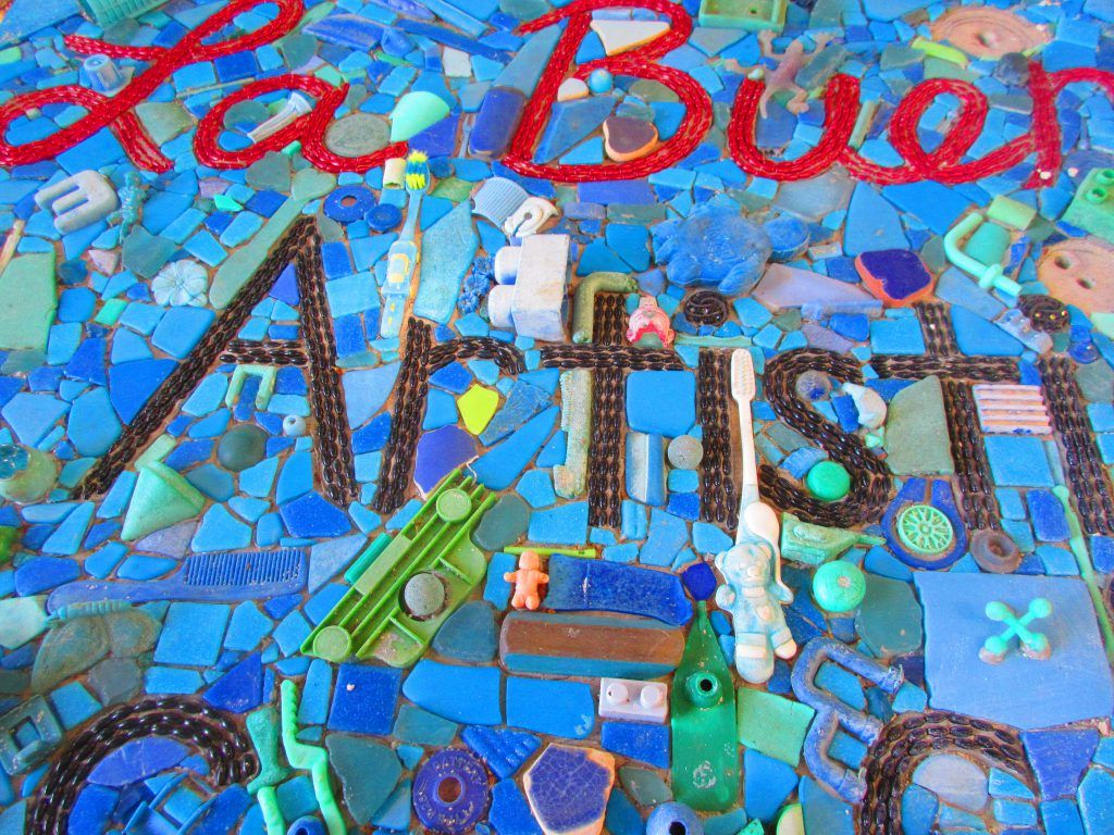 Michelle nos cuenta que siempre disfruto de crear arte pero fue en el año 2000, cuando vivió en la isla de Kodiak en Alaska en donde se encuentra una playa llamada “junk beach” la cual es uno de los botaderos de la Segunda Guerra Mundial que comenzó su inspiración de crear utilizando beach glass, cerámicas y basura de metal. En el 2005 cuando se mudaron a Panamá, los materiales de su arte cambiaron un poco y comenzo a utilizar plástico con los que crea piezas en su jardín, letreros, diferentes decoraciones, juguetes y objetos útiles.
