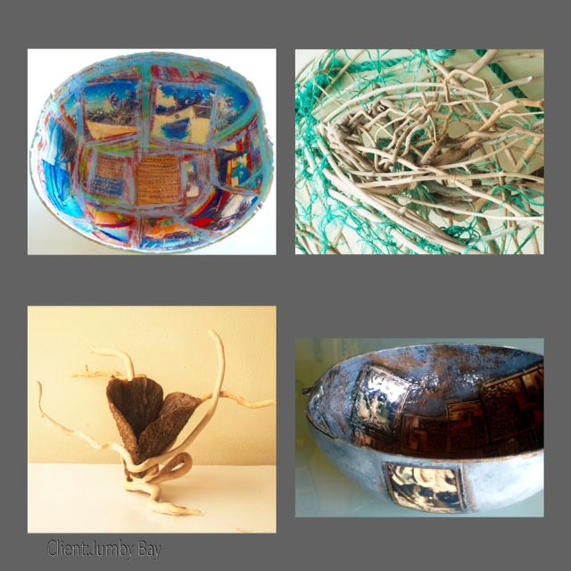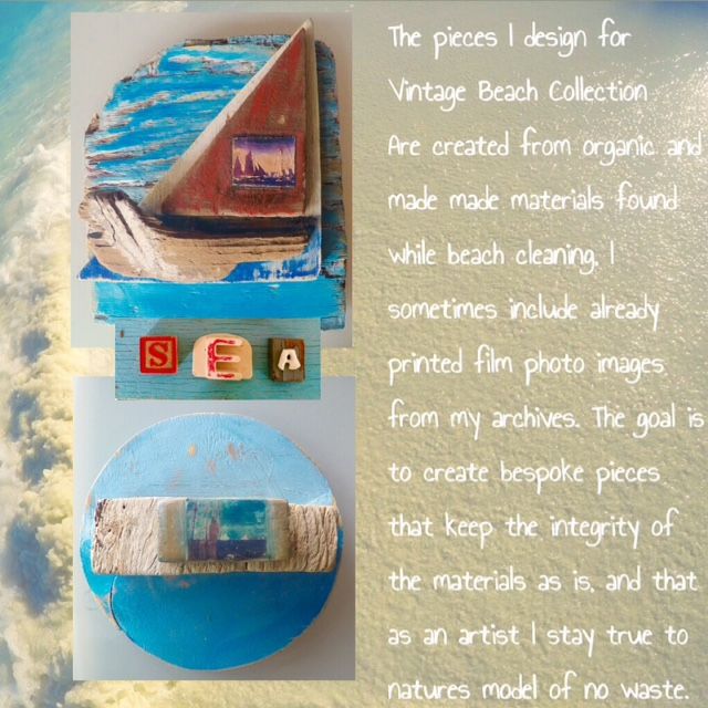 Cree el “Vintage Beach Collection” para apoyar y generar fondos para mis esfuerzos por limpiar las playas y con la esperanza de poder expandir mi visión. Las piezas de esta colección han sido creadas dentro de un modelo de no-consumismo. Utilizo solo lo que ya tengo, la mayoría son imágenes de mis archivos fotográficos y materiales que han sido encontrados, reciclados o reutilizados. Este trabajo siempre está cambiando y evolucionando dependiendo de los materiales que tengo a la mano».